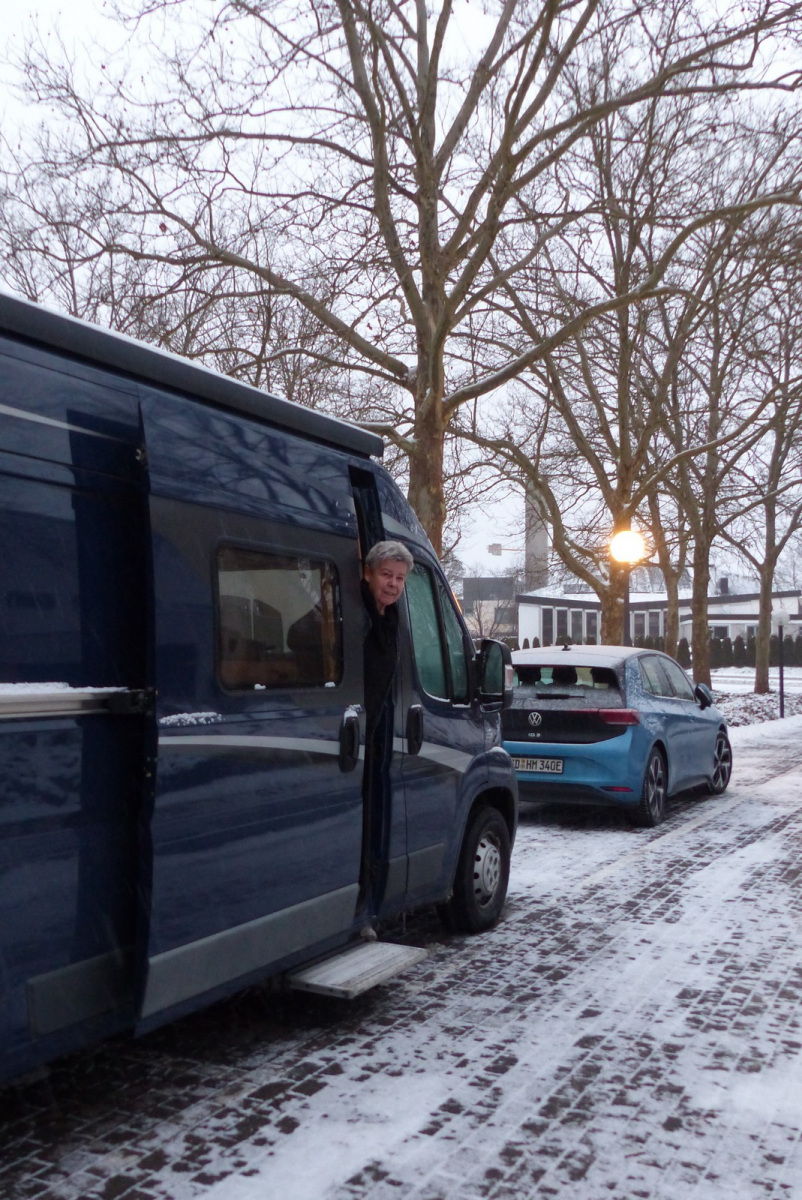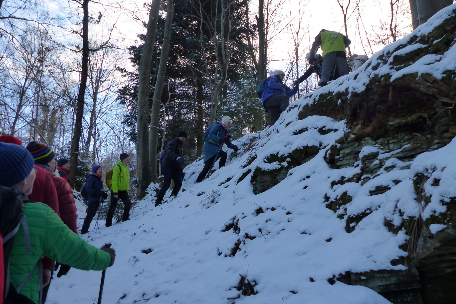 Vom nördlichen Umkehrpunkt der Wanderung kurz vor der B29 ging es durch einen idyllisch verschneiten Schiegerwald wieder bergauf zum Industriegebiet Gügling. Auch der Abschnitt entlang der Straße stellte dank der rücksichtsvollen Autofahrer kein Problem dar und führte weiter über Äcker und Felder in Richtung Lindenhof. Dort wartete bereits ein kräftiger