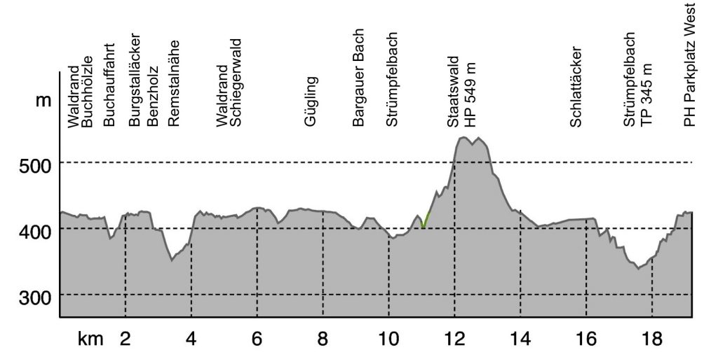 Tourdaten: ca. 20 km; 380 hm; HP 549 m; TP 345 m
